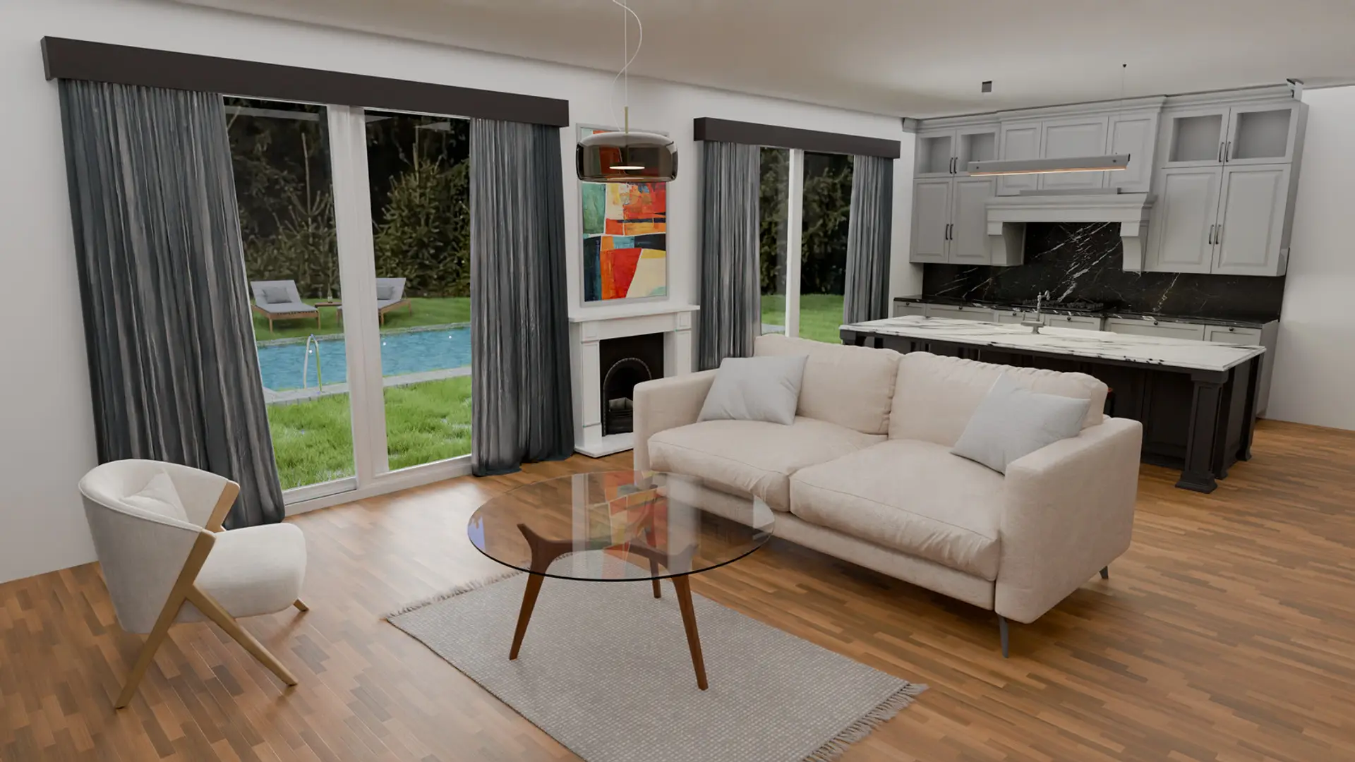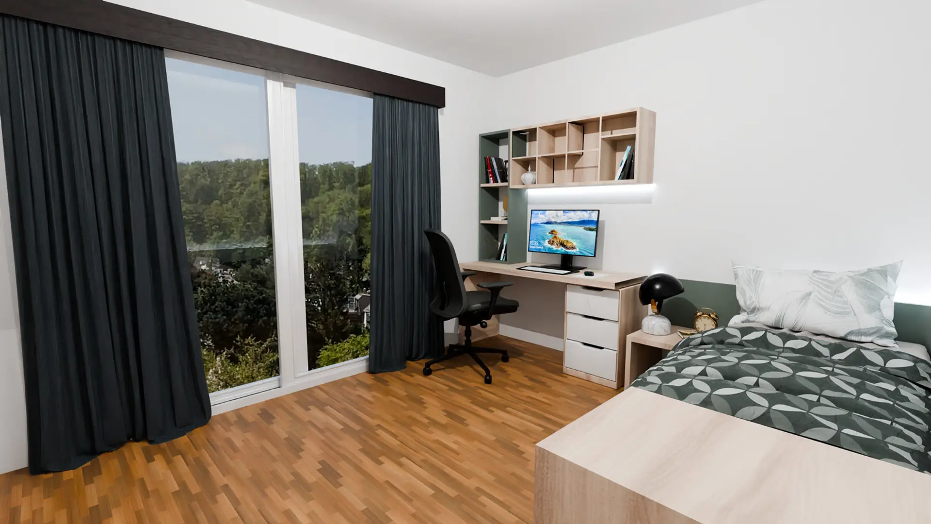 Erdwärme, Fußbodenheizung, Niedrigenergiehaus, Außenliegender Sonnenschutz, Schallschutzfenster, Grünblick