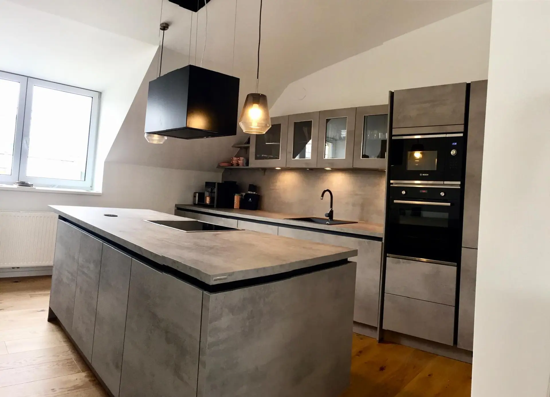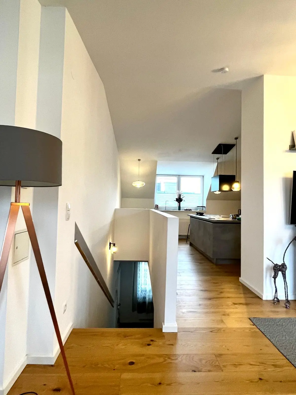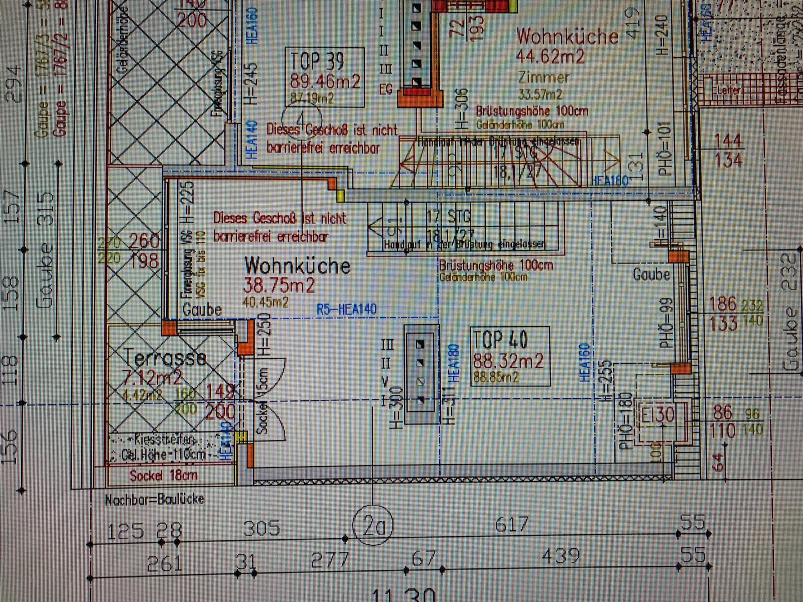 ein Vorzimmer, ein Schlafzimmer (Fenster gehen nach hinten in den Hof), einem weiterem Zimmer, ein Bad mit Dusche und Badewanne, einer schönen Holztreppe, die in die Mansarde führt. Dort befinden sich ein Wohnraum mit direktem Ausgang auf die etwa 10 m² große Terrasse (Panorama-Terrassentüre), Wienblick und einem Wohnbereich. Die Küche (39 m²) ist als offene Küche eingerichtet und komplett (Bosch) ausgestattet. Die Wohn und Schlafbereiche sind mit hochwertigen Bogen und Bahnenparketten ausgelegt, die Nassräume mit Feinsteinzeug. Dieser Wohnung ist ein Kellerabteil zugeteilt. Im Haus befindet sich ein Lift. Diese Wohnung wird möbliert übergeben.
